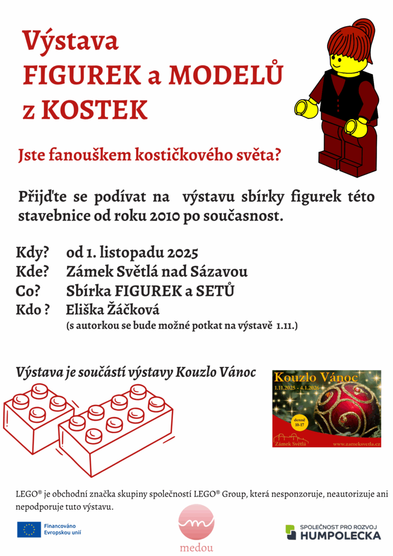 Je nám velkou ctí pozvat vás na výstavu LEGO® CMF figurek a setů. S autorkou výstavy Eliškou Žáčkovou spolupracujeme v projektu Akční plán OPZ+ MAS Humpolecka. Výstava sbírky je jejím celoživotním dílem a vy ji můžete shlédnout od 1.11.2025 na zámku ve Světlé nad Sázavou. Výstava je součástí výstavy Kouzlo Vánoc, na své si tak nepřijdou jen milovníci kostiček, ale všichni, co mají rádi Vánoce.